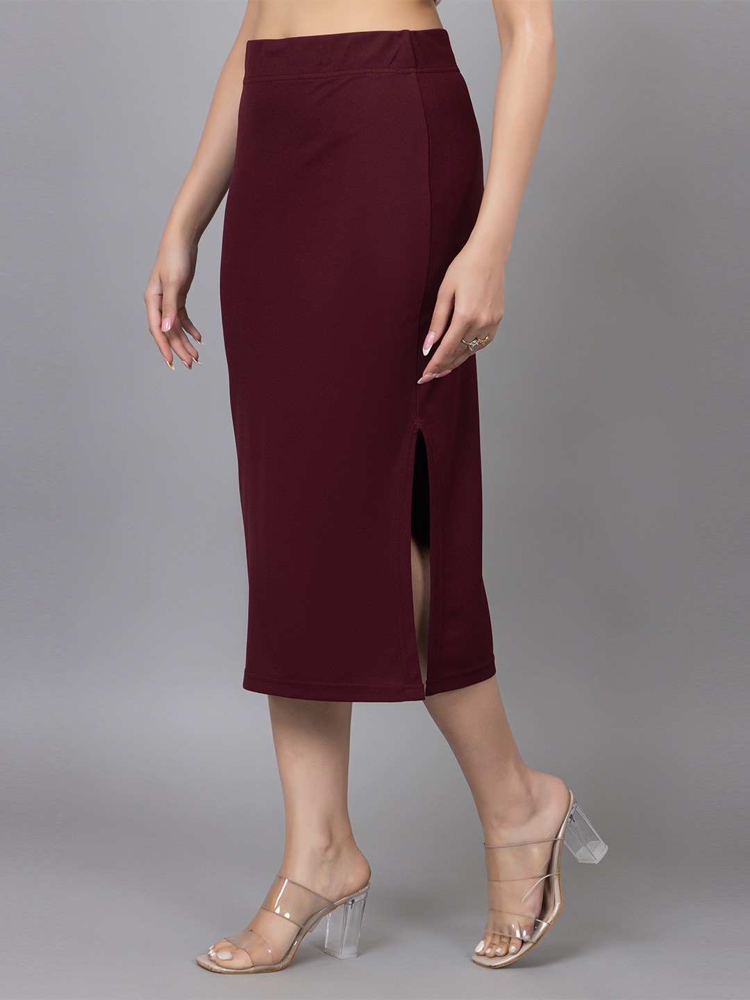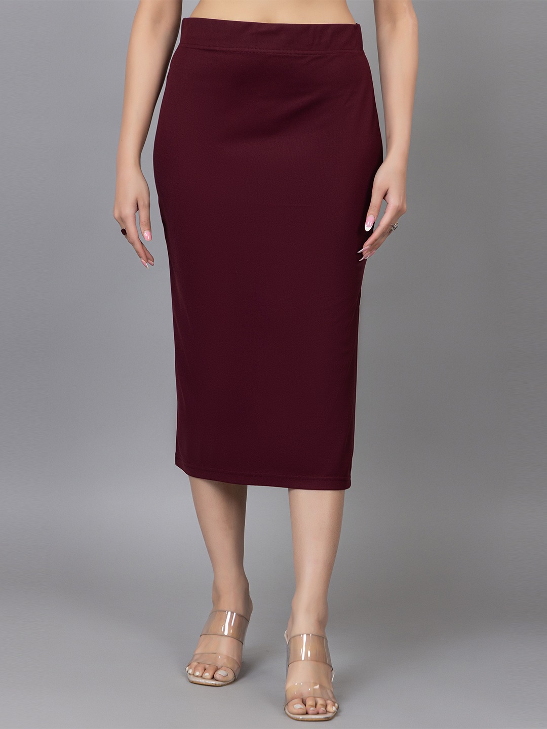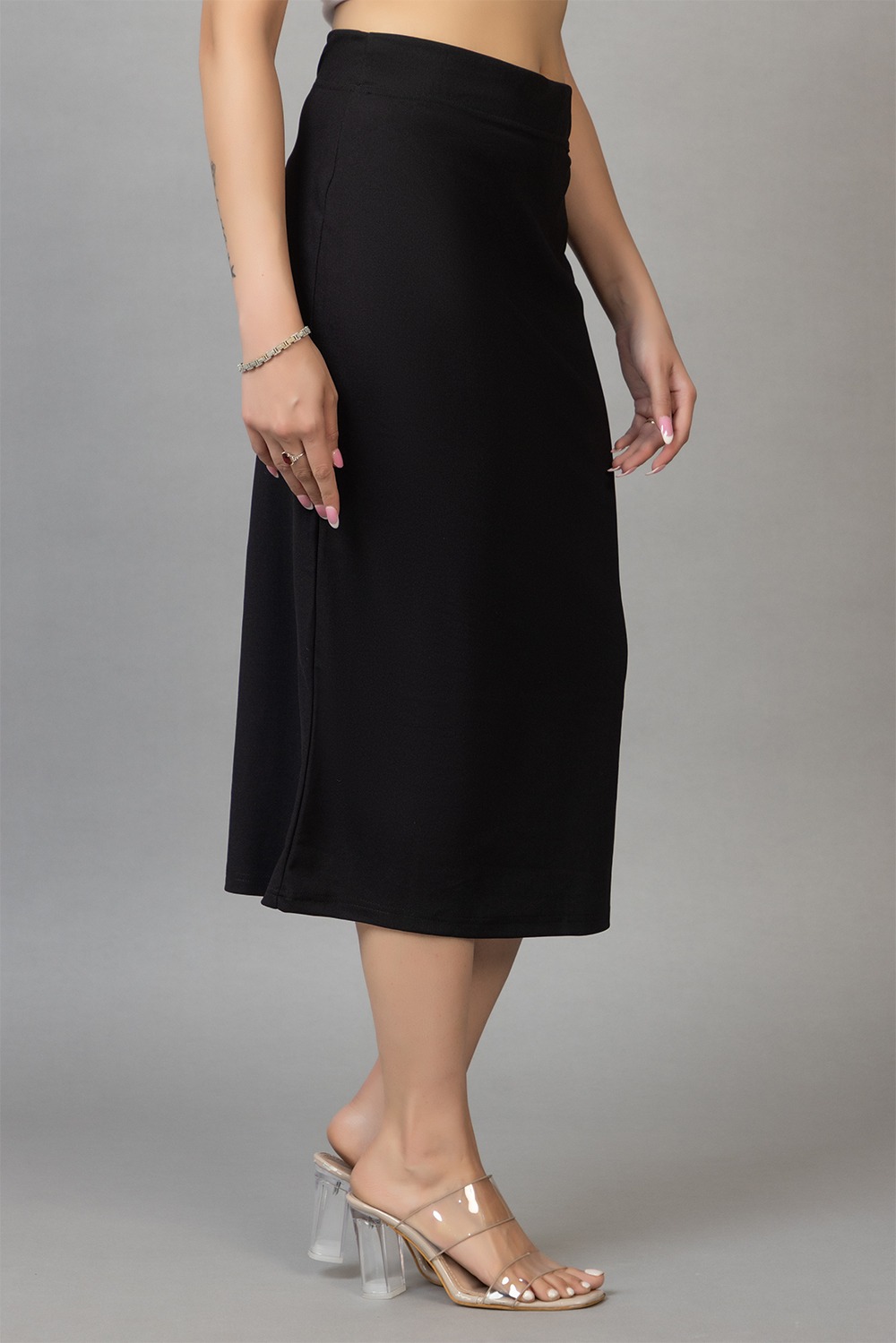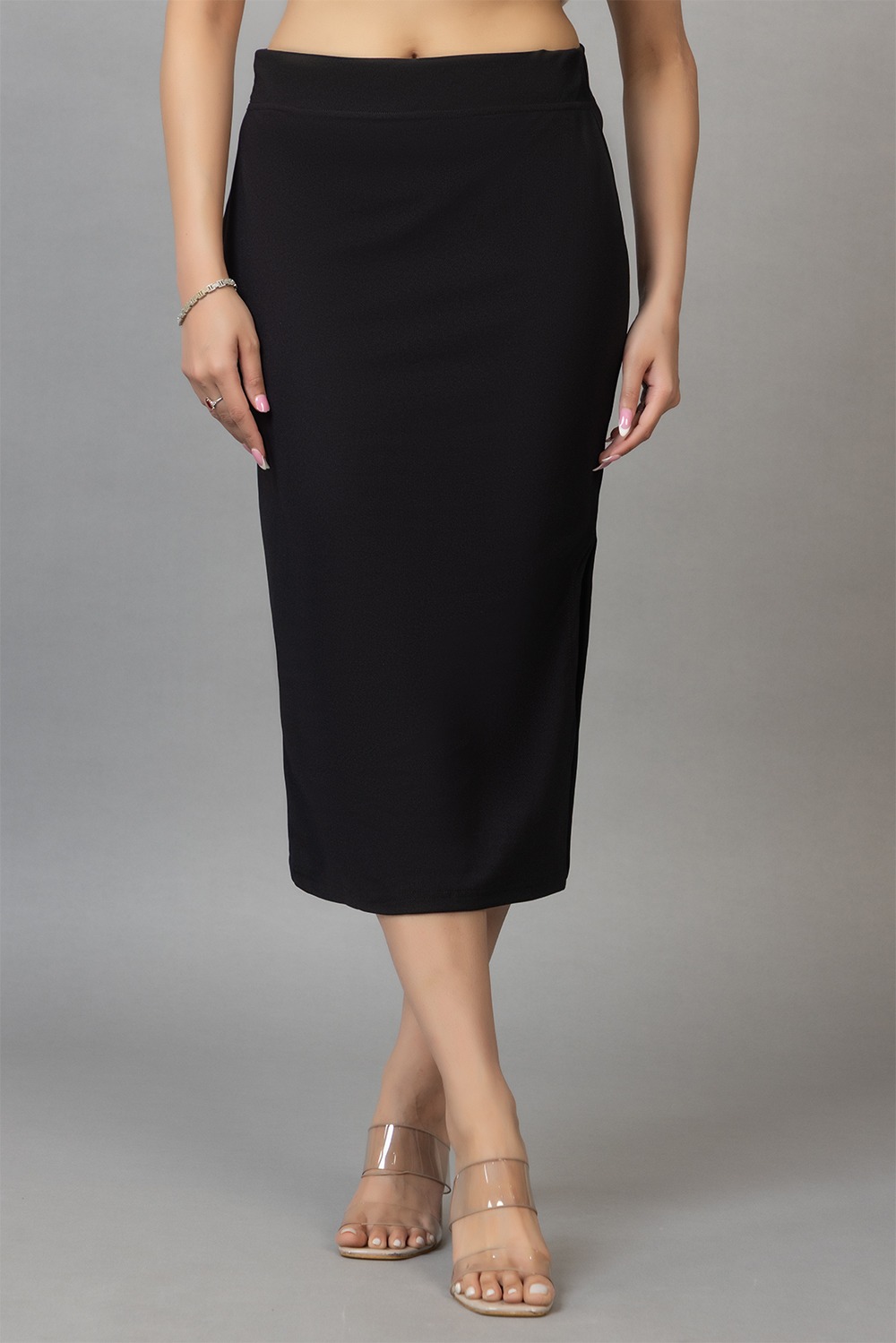 solid midi skirt Straight fit Mid-rise waist Elasticated waistband for comfortable fit Side slit for easy movement and stylish look Midi length Fabric: Polyester Occasion: Casual / Daily Wear / Office Wear