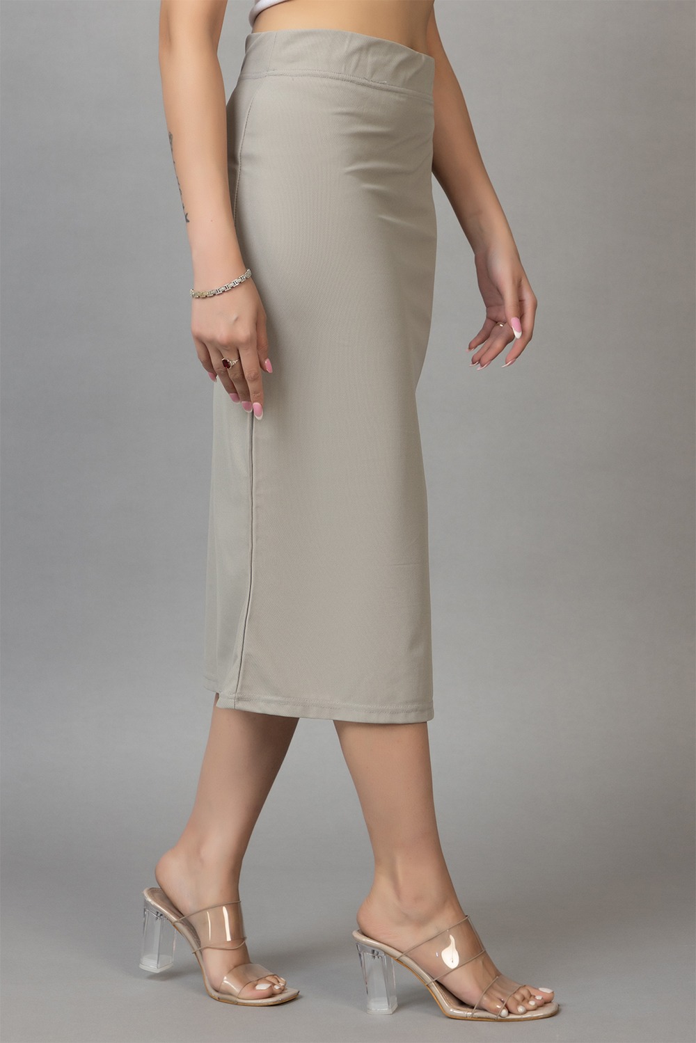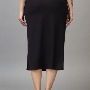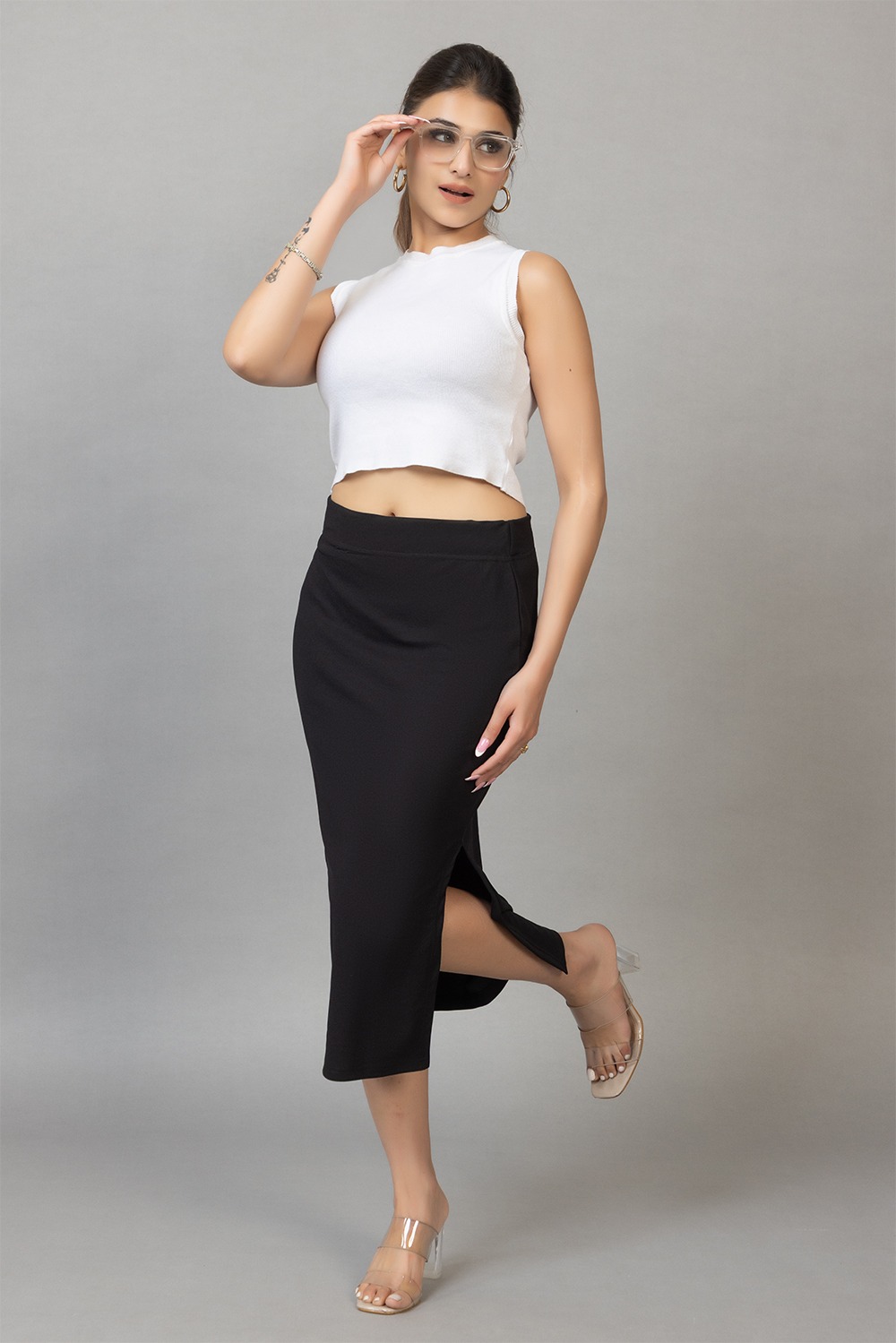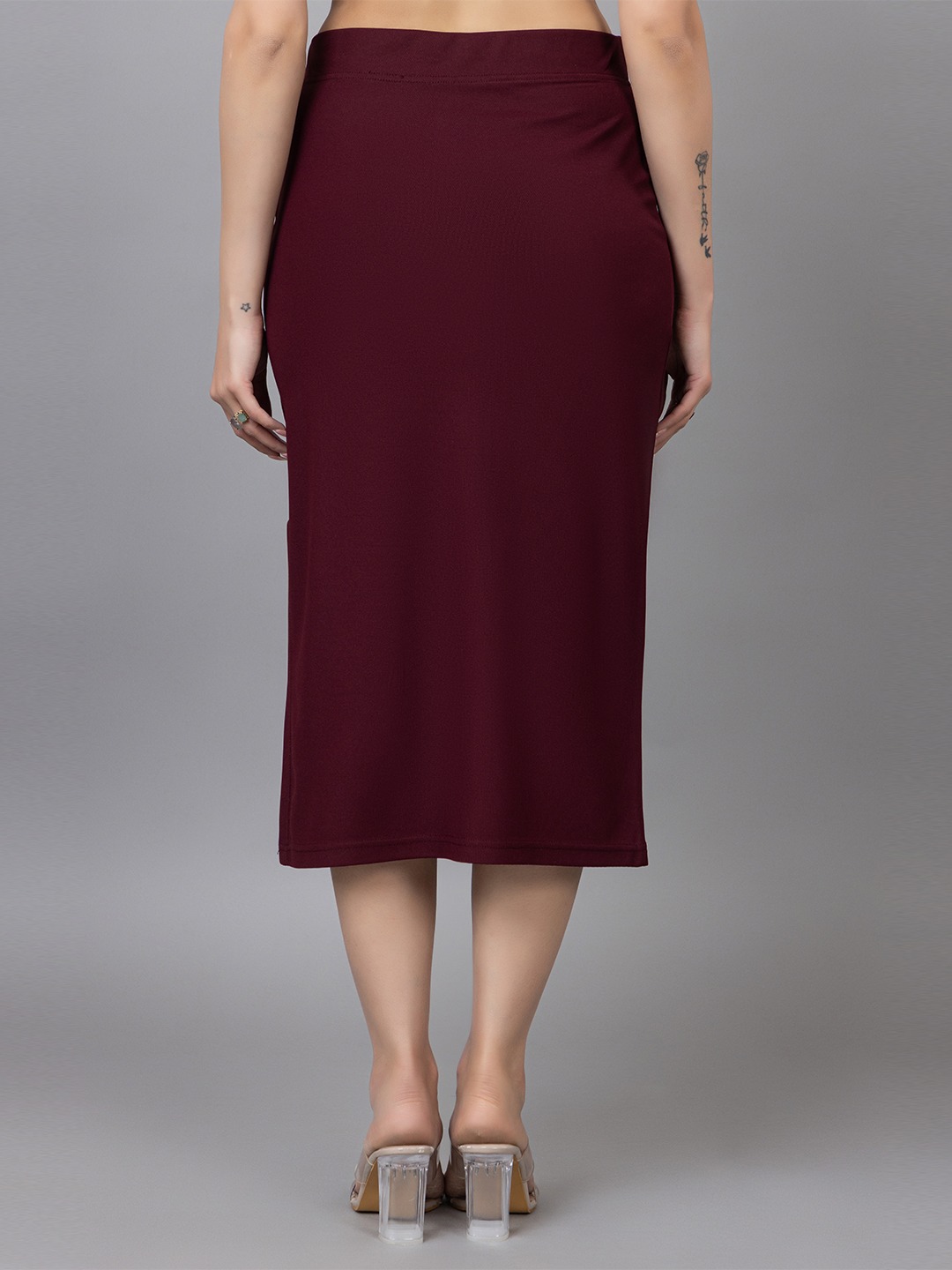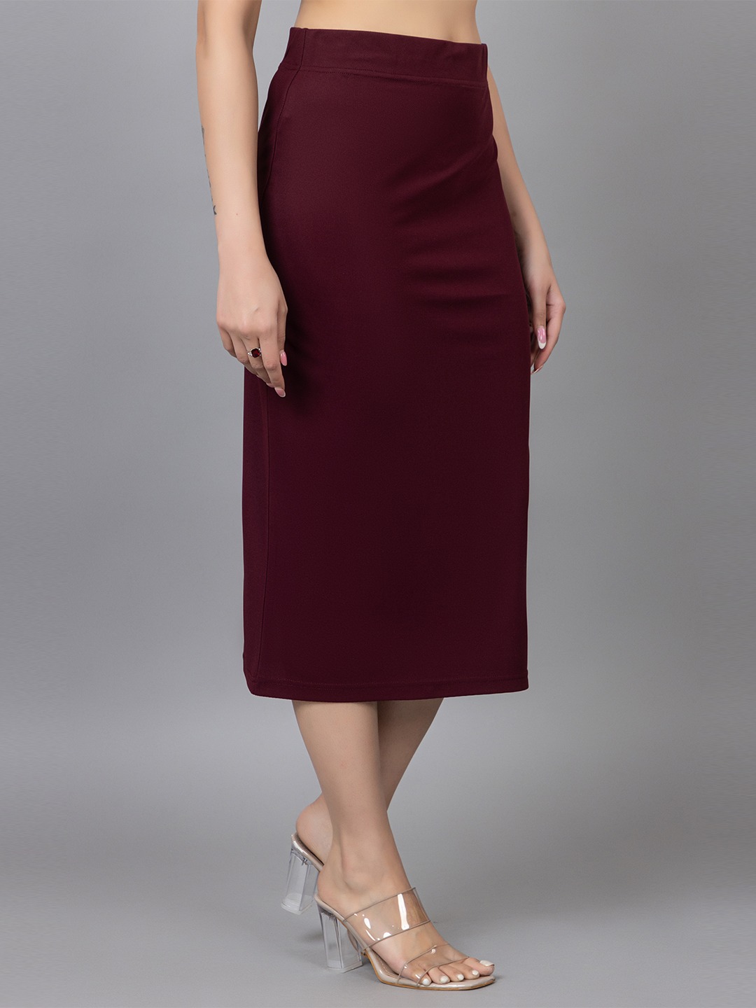 solid midi skirt Straight fit Mid-rise waist Elasticated waistband for comfortable fit Side slit for easy movement and stylish look Midi length Fabric: Polyester Occasion: Casual / Daily Wear / Office Wear
