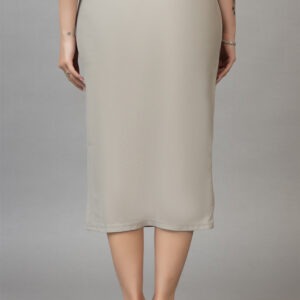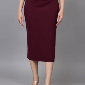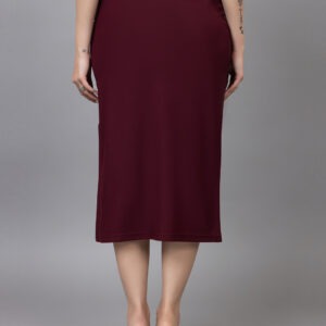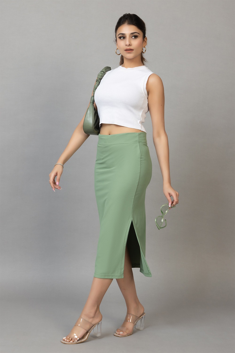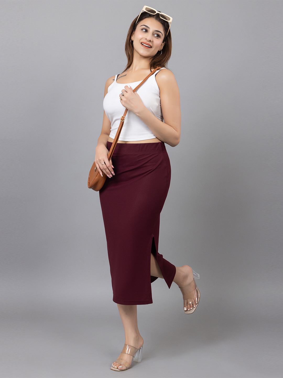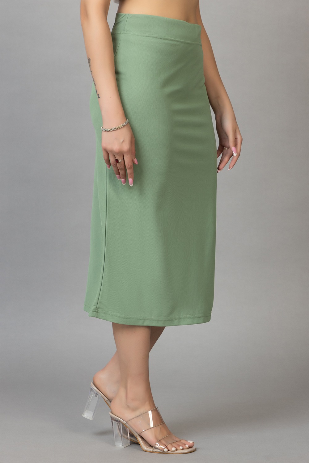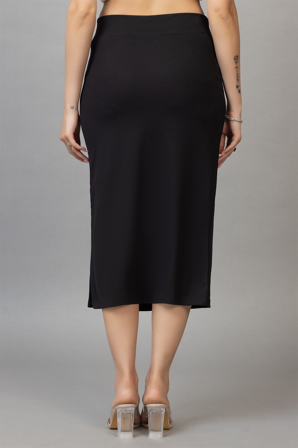 solid midi skirt Straight fit Mid-rise waist Elasticated waistband for comfortable fit Side slit for easy movement and stylish look Midi length Fabric: Polyester Occasion: Casual / Daily Wear / Office Wear