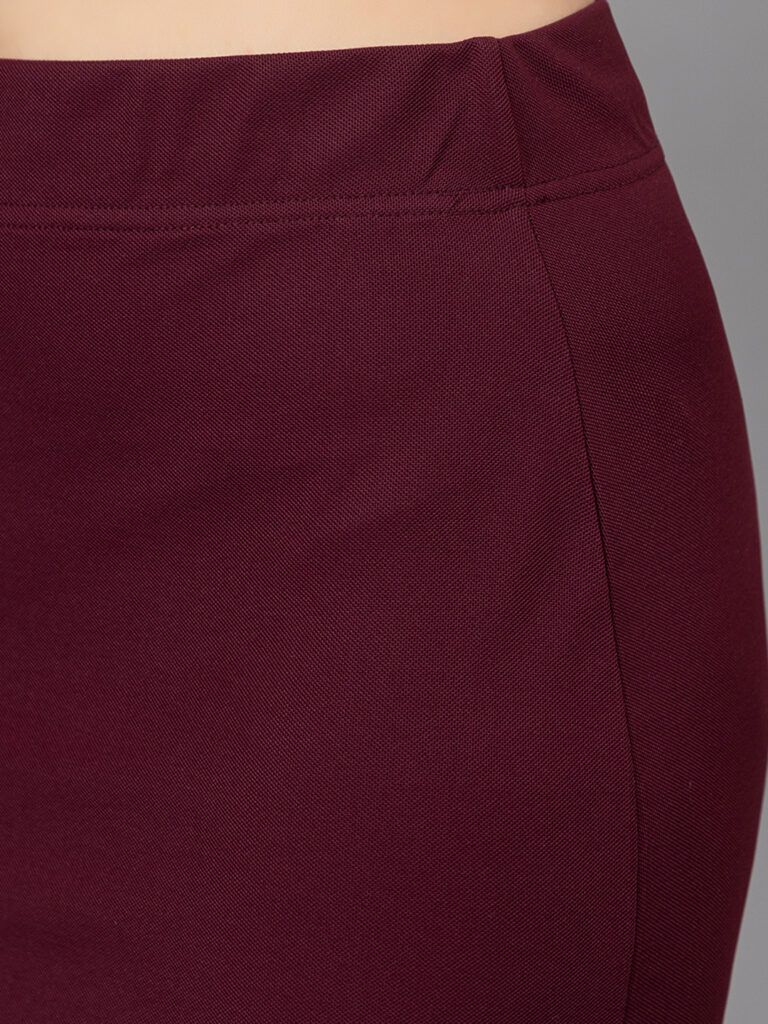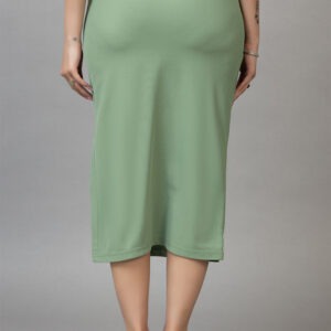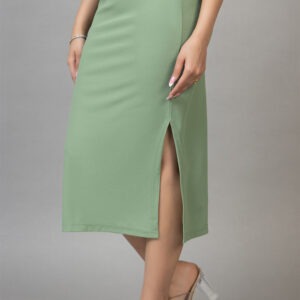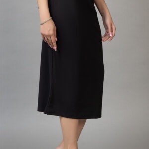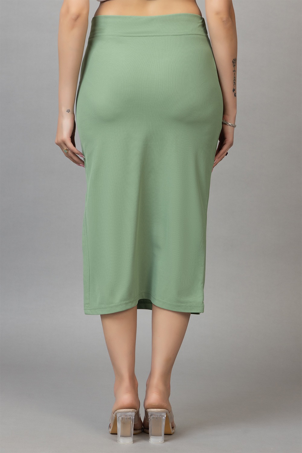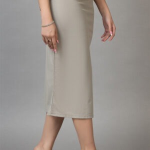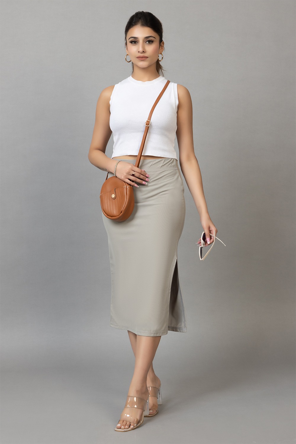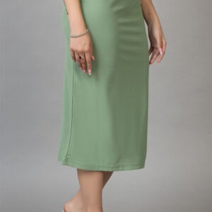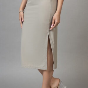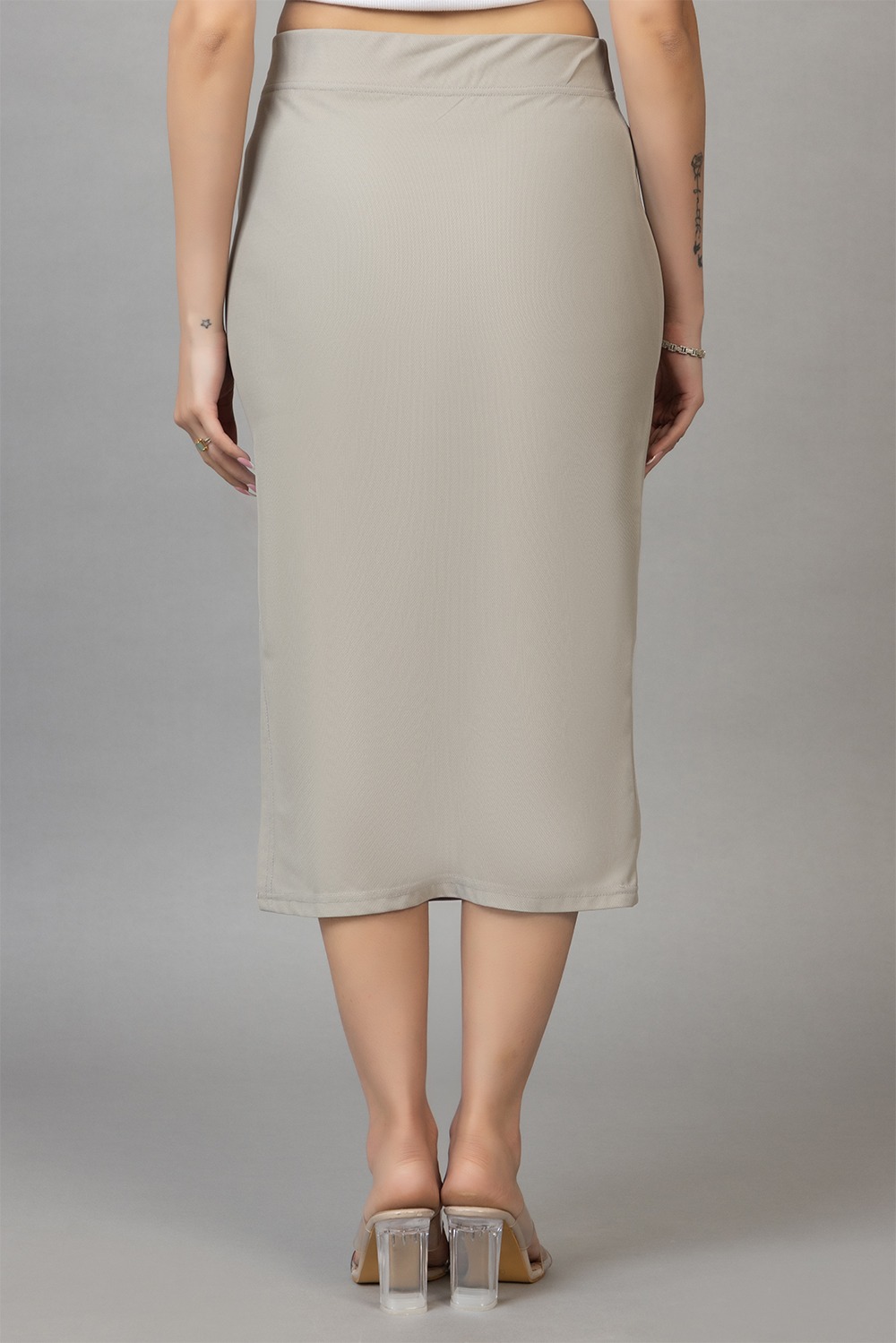 solid midi skirt Straight fit Mid-rise waist Elasticated waistband for comfortable fit Side slit for easy movement and stylish look Midi length Fabric: Polyester Occasion: Casual / Daily Wear / Office Wear
